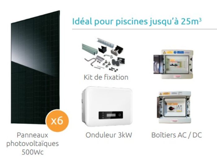 Le kit 3kWc fonctionne en autoconsommation directe. Il produit de l’électricité grâce à ses panneaux photovoltaïques et alimente en temps réel les équipements techniques de votre piscine. L’énergie solaire captée est transformée via un onduleur compact, silencieux et performant.