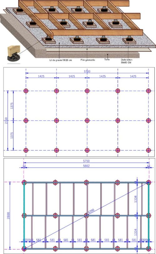 • Poser des dalles béton de 50X50 cm sur le gravier suivant les plans ci-contre