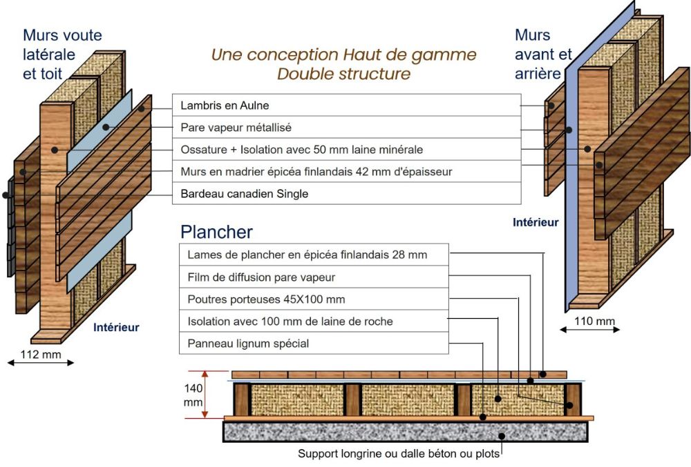 Conception technique haut de gamme avec isolation 4 saisons, comprenant une structure double parois en madrier massif de 42 mm + Ossature bois isolée laine de roche de 50 mm
