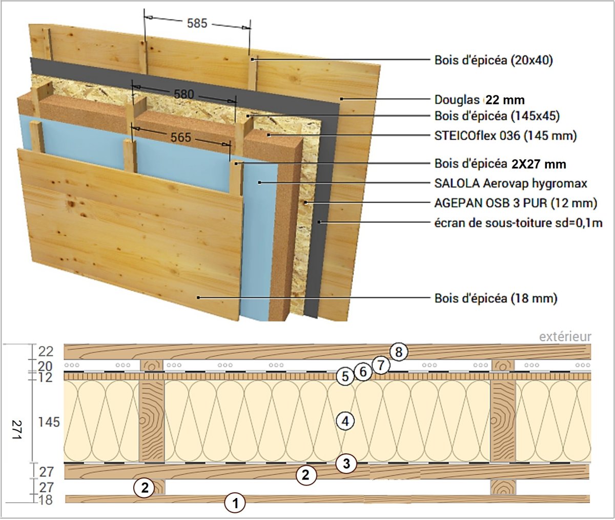 Il existe de nombreuses solutions constructives pour fabriquer des parois, murs, planchers et toitures d’un logement en ossature bois. La nature des matériaux et épaisseurs peuvent, faire varier un prix de plus ou moins 40%. Un mur de 271 mm d’épaisseur ne peut pas couter le même prix qu’un de 120 mm…